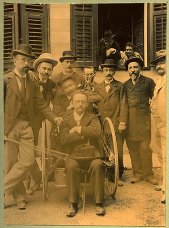 Gruppo di uomini in posa, due dei quali seduti su un velocipide, all'aperto |