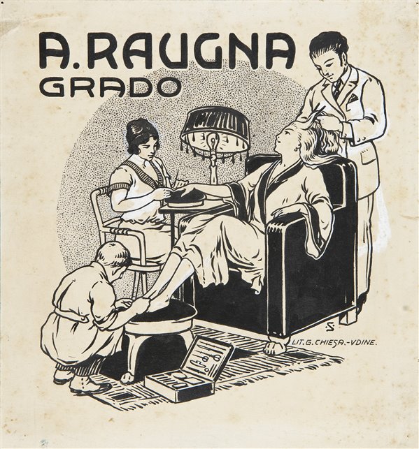 | Note | Campione per cartello pubblicitario di A. Raugna di Grado. Un'avvenente signora in vestaglia è adagiata morbidamente su una robusta poltrona scura, probabilmente in pelle, mentre tre persone - due uomini e solo una donna - si occupano premurosamente di lei, con taglio di capelli e manicure. L'immagine fa così pensare ad un salone di bellezza in cui ogni cliente viene vezzeggiato e trattato con le massime attenzioni, sentendosi come a casa sua - l'arredamento ricorda infatti più un ambiente domestico che un esercizio pubblico. Gli anni ’30 furono un periodo di molta femminilità e fascino per gli stili di capelli e maquillage. Il periodo dopo la Prima Guerra Mondiale fu prosperoso per molte famiglie e questa libertà permise alle donne, che avevano risparmiato e fatto sacrifici durante la guerra, di frequentare i saloni di bellezza e acquistare cosmetici. Nato a trieste il 6 luglio 1875 ed attivo nella città giuliana nei primi anni del '900, Sencig (poi Senci) si dedica soprattutto alla grafica applicata alla cartolina e a varie forme di ricorrenza o pubblicità come locandine o manifesti. Disegna per la Lega Nazionale, per la Festa del Grillo. Nel 1923 si trasferisce definitivamente a Udine ed avvia un rapporto di collaborazione con lo Stabilimento Passero-Chiesa di cui diviene il principale disegnatore "interno" conseguendo un'attività cartellonistica di un certo spessore. Si esprime con una grafica di ascendenza austriaca fatta di solido e brillante naturalismo che porta negli anni '20 ad una dimensione più popolare e a tratti fumettistica. L'artista si evolve poi verso una stilizzazione che negli anni '30 si impregna di novecentismo e raggiunge esiti di esasperata geometrizzazione. Muore a Udine il 2 novembre 1952. |