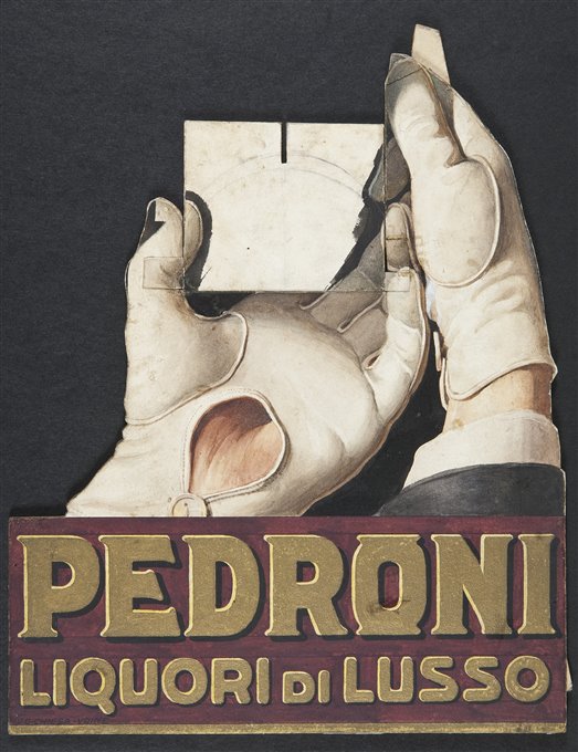 | Note | Espositore creato con cartone fustellato per l'azienda Pedroni in cui due mani maschili vestite da candidi guanti sostengono il prodotto, in questo caso una bottiglia di liquore che però non viene rappresentato nel cartellone pubblicitario poichè presente materialmente, in uno spazio appositamente creato nell'espositore, nel quale questo viene appoggiato. Si crea in tal modo uno strano gioco in cui merce e operazione promozionale diventano un tutt'uno, imprimendosi nella memoria dell'ipotetico, futuro compratore. A caratteri monumentali il nome dell'azienda. La storia delle Distillerie inizia a poco più di un decennio dall’unificazione dell’Italia, sotto il Regno di Vittorio Emanuele II°. Una medaglia conferita all’Esposizione Sociale Permanente di Napoli ed alcune testimonianze segnalano l’esistenza di una “Pedroni & Comp.” di Giovanni Pedroni con Visconti e Canzi già nel 1870, ma la fondazione della Casa viene fatta ufficialmente risalire al 1872, quando Rinaldo ed Ernesto Pedroni creano la società “Pedroni e Visconti” per la fabbricazione di liquori e sciroppi. Dopo il ritiro del socio i due fratelli proseguono e sviluppano l’attività dell’azienda con la ragione sociale di “Pedroni & C.” fino a farla conoscere, ancor prima della fine del secolo, su tutto il territorio nazionale e all’estero, ottenendo importanti premi e riconoscimenti: Esposizione Generale di Torino (1884), Bordeaux (1882), Parigi, Buenos Aires, Santiago del Cile (1875). Nel 1908 l’azienda assume il nome di “Distillerie Pedroni Società Anonima” ed entrano in Società i figli di Ernesto che ne manterranno la conduzione per oltre un quarantennio. L’attività dell’azienda prosegue regolarmente anche durante la Prima Guerra Mondiale. Fra il 1919 ed il 1930 le Distillerie Pedroni registrano il periodo più lungo ed ininterrotto di risultati utili e di espansione, offrendo una gamma di oltre 100 prodotti, tra i quali Cognac, Rhum, Amari, Aperitivi, Punch, Rosoli, Creme, Liquori, Sciroppi e le specialità che hanno dato lustro all’azienda: la China ed il Fernet. I brillanti risultati del periodo consentono alle Distillerie Pedroni di espandere la fabbrica e di rinnovare impianti ed attrezzature. L’operare in un segmento di alta qualità, la fedeltà della clientela, la situazione finanziaria non gravata da oneri e l’oculata gestione delle spese generali permettono all’azienda di superare la concomitanza e le conseguenze della grave situazione politica, sociale, economica nazionale ed internazionale del periodo compreso fra il 1930 e la fine della Seconda Guerra Mondiale. Nei primi Anni Quaranta le Distillerie Pedroni possono contare su una gamma di prodotti e di specialità ancora più ampia di quella già ricca del passato. Nel 1966 cessa l’attività ed il suo scioglimento avviene nel 1973, dopo un secolo di vita. |