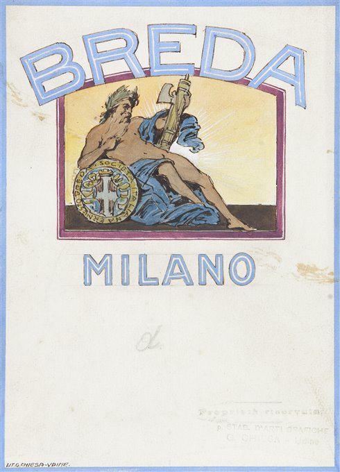 | Note | Bozzetto pubblicitario per la Società italiana Breda per costruzioni meccaniche. Presenti nel Fondo Chiesa altri due esemplari realizzati per la ditta Breda (n.FC58 e n.FC90). La Società Italiana Ernesto Breda per Costruzioni Meccaniche è stata un'importante azienda italiana del XX secolo. L'azienda operava nei settori metalmeccanico (costruzioni ferroviarie, aerei militari, autocarri, motociclette, macchine industriali, agricole e per l'edilizia), siderurgico ed armiero. Sebbene oggi non esista più una “Breda” in senso stretto, diverse aziende tuttora utilizzano la denominazione “Breda” ed il relativo simbolo (un cavallo), dopo avere rilevato alcune attività dall’azienda originaria. Fu fondata a Milano nel 1886 dall'ingegnere padovano Ernesto Breda, che aveva rilevato "L'Elvetica", piccola società meccanica e ferroviaria milanese. La Breda fu inizialmente una società in accomandita, e venne trasformata nel 1899 in società anonima, con la denominazione di "Società Italiana Ernesto Breda per Costruzioni Meccaniche". L’attività più importante era quella di produzione di locomotive, che beneficiava delle commesse pubbliche per lo sviluppo della rete ferroviaria nazionale. Ma l’azienda operava in molti altre lavorazioni meccaniche, come la fucinatura di pezzi metallici, la produzione di caldaie, macchine utensili e macchine agricole. All’originario stabilimento di Milano situato lungo la Martesana, all’inizio del Novecento la Breda aggiunse dei nuovi impianti che occupavano una vasta area al confine tra Milano (zona della Bicocca) e Sesto San Giovanni, all’epoca all’avanguardia in fatto di automazione e di organizzazione del lavoro. Con lo scoppio della prima guerra mondiale, la necessità di forniture belliche durante il conflitto si rivelò molto importante per lo sviluppo della Breda, che si orientò decisamente verso le produzioni di proiettili, cannoni ed aeroplani da combattimento. Ma la difficoltà a reperire materie prime (l'acciaio) e tecnologia (macchine utensili) spinse l'azienda ad integrarsi ulteriormente a monte, con la costruzione di un'acciaieria interna. Questo portò a notevoli difficoltà di riconversione nel dopoguerra, superate