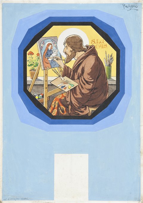 | Note | Bozzetto generico per calendario pubblicitario eseguito da Pietro Antonio Sencig che appone la sua firma nell'angolo superiore destro. L'immagine propone San Luca Evangelista - protettore di artisti, pittori e scultori - intento a dipingere una Madonna con Bambino. Il tema del bozzetto fa supporre che la committenza provenga da un ordine religioso ma, osservando con più attenzione il disegno, una seconda ipotesi può essere considerata. Se infatti, ad un primo sguardo, nell'immagine si rileva principalmente la bidimensionalità resa dalla figura del santo posto di profilo, si nota poi, con altrettanta evidenza, il particolare della tavolozza la quale sembra quasi uscire dalla cornice ottagonale che delimita la scena dipinta. Oltre alla tavolozza vengono riprodotti nel bozzetto anche dei pennelli, posti sulla balaustra, e alcuni tubetti di colore stipati sietro il cavalletto, prodotti per dipingere che all'epoca si vendeva nelle drogherie. La bozza di calendario potrebbe quindi essere stata realizzata per la promozione di un esercizio commerciale appartenente a questa tipologia. |