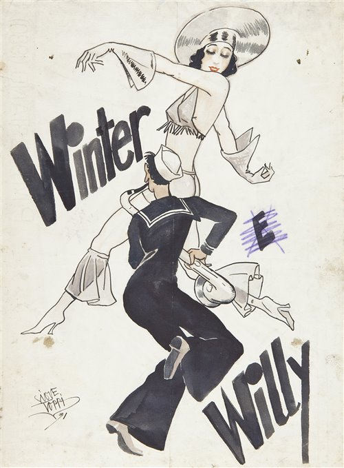 | Note | Giove Toppi nacque ad Ancona il 2 agosto del 1889. Esordì nel campo dei fumetti nel 1918 sul periodico "La Voce del Piave". Negli anni Venti si trasferisce a Firenze dove, collaborando con testate quali "il Giornalino della Domenica" e "Il Brivido", incontra l'editore Nerbini con il quale iniziò una grande collaborazione divenendo, tra l'altro, una colonna portante del settimanale satirico "Il 420" (grazie anche alla collaborazione di Gino Schiatti). Toppi fu l'autore di centinaia di copertine ed illustrazioni per gli albi Nerbini degli Anni 20 e 30, ed il suo posto nella storia gli deriva, da un punto di vista strettamente Disney, dall'aver realizzato la prima storia italiana di Topolino (con lo pseudonimo di Stop) col celebre topo (ancora molto lontano dal modello americano di Gottfredson, a dire la verità) alle prese di un buffo elefante. Il bozzetto, raffigurante una ballerina in costume di scena ed un suonatore di sassofono in abiti da marinaio, allude forse ad uno spettacolo musicale o ad un evento concertistico di musica jazz. Dubbia la provenienza di questo bozzetto dagli uffici creativi dello stabilimento udinese della famiglia Chiesa. |