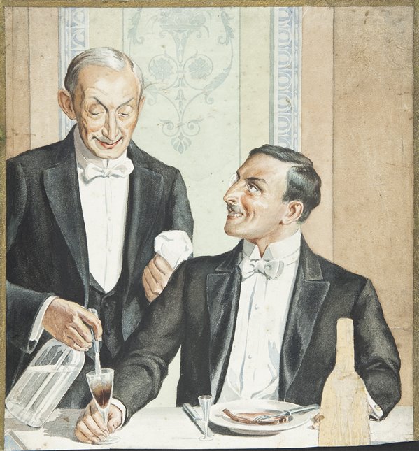 | Note | Bozzetto generico molto probabilmente creato per la pubblicizzazione di una bevanda alcolica o di un'acqua minerale di cui si vede soltanto la sagoma non dipinta in primo piano. Dietro ad essa un tavolo imbandito ed un garbato cameriere che versa dell'acqua ad un uomo - anch'egli dallo guardo affabile - elegantemente vestito con un abito sartoriale ornato da un bianco papillon, quasi certamente un frac. La situazione narrata nell'immagine appare cordiale e familiare; forse il canuto cameriere sta consigliando al gentiluomo come sorbire più piacevolmente la bevanda dalla bottiglia misteriosa, in parte già ersata nel suo calice. Scena dal sapore retrò, di tempi per certi versi ancora immutati ma che si stanno avviando verso un mutamento sostanziale. |