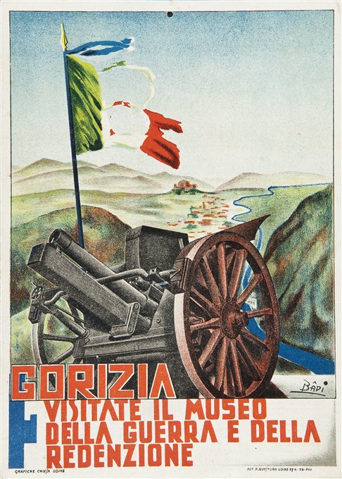 | Note | Il manifesto, firmato Bapi e realizzato per il Museo della Guerra e della Redenzione di Gorizia, mostra in primo piano un imponente cannone sul quale svetta, lacerata ma fiera, la bandiera italiana con sopra un nastro azzurro, a ricordare la Casa Reale dei Savoia. Sullo sfondo le colline del goriziano, solcate dal fiume Isonzo, simbolo delle sanguinose battaglie combattute lungo l sue rive, ed un abbozzato eppure riconoscibile castello risalente al secolo XI, cuore antico della città situato sull'altura che sovrasta la località isontina. II Musei Provinciali di Gorizia, fondati nel 1861 comprendevano una sezione naturalistica e una storico-antiquaria. Dalla sede originaria, nel 1900 furono trasferiti a palazzo Attems-Petzenstein. L’8 giugno 1924 veniva inaugurato il “Museo della Redenzione”, idea e frutto del lavoro di raccolta iniziato già durante la guerra da Giovanni Cossar. Il museo voleva testimoniare l’italianità della città di Gorizia da poco entrata a far parte dello Stato Italiano. La vicenda bellica si inseriva così nel museo, che raccontava la storia di questo territorio dall’epoca preistorica alla contemporaneità. L’allestimento fu completamente ridefinito nel 1938 quando il museo ebbe la denominazione di “Museo della Guerra e della Redenzione”. Con il passare del tempo i reperti bellici aumentarono in misura tale che, nel 1939, le collezioni storico-artistiche dovettero essere trasferite in una nuova sede, a Borgo Castello, mentre il museo della guerra rimaneva a Palazzo Attems. Qui, dopo ulteriori modifiche attuate nel secondo dopoguerra, il museo rimase fino al 1983, quando fu gravemente danneggiato da un’alluvione. Fu allora necessario un lungo lavoro di restauro e riordino delle raccolte. Il rinnovato museo, inaugurato nel giugno del 1990 nei sotterranei delle antiche case Dornberg e Tasso in Borgo Castello, è il frutto di un progetto lungamente meditato in linea con la più aggiornata storiografia. |