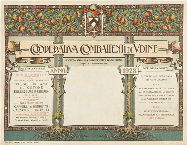| Note | Calendario promozionale del 1923 realizzato per la Cooperativa Combattenti di Udine, società cooperativa di consumo fondata nel novembre 1919. Testi firmati da Benito Mussolini e del fratello Arnaldo. Al centro della locandina una cartina in cui sono indicati i luoghi in cui sono dislocate le Istituzioni federate del territorio. Scopi della Società: giovare all'economia dei consumatori ed aiutare, con gli eventuali utili, gli ex combattenti e le loro famiglie e le istituzioni di beneficienza. Finalità ed elenco degli esercizi associati vengono proposti nelle bande laterali del calendario mentre lo spazio centrale è riservato all'applicazione dell'almanacco a fogli. |
