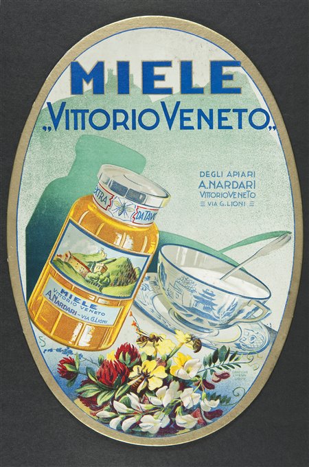 | Note | Cartello pubblicitario realizzato per l'azienda Nardari di Vittorio Veneto, produttrice di miele. Un vasetto del benefico prodotto campeggia in primo piano, accanto ad una tazza di porcellana contenente del latte, connubio ideale e migliore rimedio naturale per curare la tosse. L'illustrazione è realizzata da Pietro Antonio Sencig che si firma, proprio sotto il dolce contenitore, con la nota S puntata da entrambi i lati. Nato a Trieste il 6 luglio 1875 ed attivo nella città giuliana nei primi anni del '900, Pietro Antonio Sencig (poi Senci) si dedica soprattutto alla grafica applicata alla cartolina e a varie forme di ricorrenza o pubblicità come locandine o manifesti. Disegna per la Lega nazionale, per la festa del grillo. Nel 1923 si trasferisce definitivamente a Udine ed avvia un rapporto di collaborazione con lo stabilimento Passero-Chiesa di cui diviene il principale disegnatore "interno" conseguendo un'attività cartellonistica di un certo spessore. Si esprime con una grafica di ascendenza austriaca fatta di solido e brillante naturalismo che porta negli anni '20 ad una dimensione più popolare e a tratti fumettistica. L'artista si evolve poi verso una stilizzazione che negli anni '30 si impregna di novecentismo e raggiunge esiti di esasperata geometrizzazione. Muore a Udine il 2 novembre 1952. |