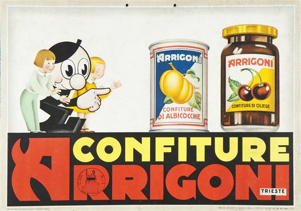 | Note | Cartello pubblicitario della ditta Arrigoni che vede illustrato il popolare personaggio dalla testa tonda, grandi mani e corspo sintetizzato in poche linee, che negli anni '30 ha rappresentato un segno distintivo dell'azienda, quello che il famoso pubblicitario, illustratore e caricaturista italiano Leonetto Cappiello chiamava "personaggio-idea". Il marchio Arrigoni ha accompagnato intere generazioni durante la sua lunga storia di ben centocinquanta anni. È nel lontano 1855 ad Isola d'Istria che, inconsapevolmente, si gettano le basi per quella che sarà, per molto tempo, la più grande industria alimentare italiana. La G. Arrigoni ha vissuto le vicissitudini storiche italiane in tutta la loro parte, e, come tutte le aziende storiche, ha alternato momenti di costruzione ad altri di ricostruzione. L'azienda ha impiegato la sua professionalità nella produzione di molti generi del settore alimentare: dalla lavorazione del pesce ai i dadi da brodo, dalla confezione e conservazione dei vegetali (pomodori e legumi) alla nota e grande specializzazione nella lavorazione della frutta (confetture, succhi e sciroppi) che hanno reso l'azienda Arrigoni - come cita lo slogan: "La G. Arrigoni industria alimentare a tutto campo" - indiscusso leader nazionale ed internazionale per molti anni. |