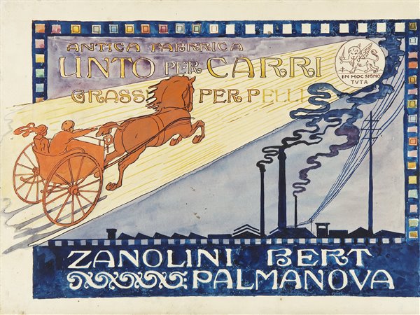 | Note | Bozzetto realizzato per la pubblicizzazione della ditta Zanolini Bert di Palmanova. L'antica fabbrica, produttrice di miscela di ingrassi per pelli ed unto per carri, viene raccontata nel bozzetto in maniera fiabesca e suggestiva: fumosi camini e ciminiere disegnano sinuose silhouette nel cielo ombroso mentre un calesse trainato da un aitante destriero sfreccia lungo un fascio luminoso. Forse tanta speditezza è derivata da un carro accuratamente oliato e da finimenti perfettamente lubrificati grazie, naturalmente, ai prodotti Zanolini Bert. Oltre al segno curvilineo ed elegante proprio dell'Art Nouveau, anche il lettering e la cornice che decora il bozzetto derivano dal linguaggio Liberty. |