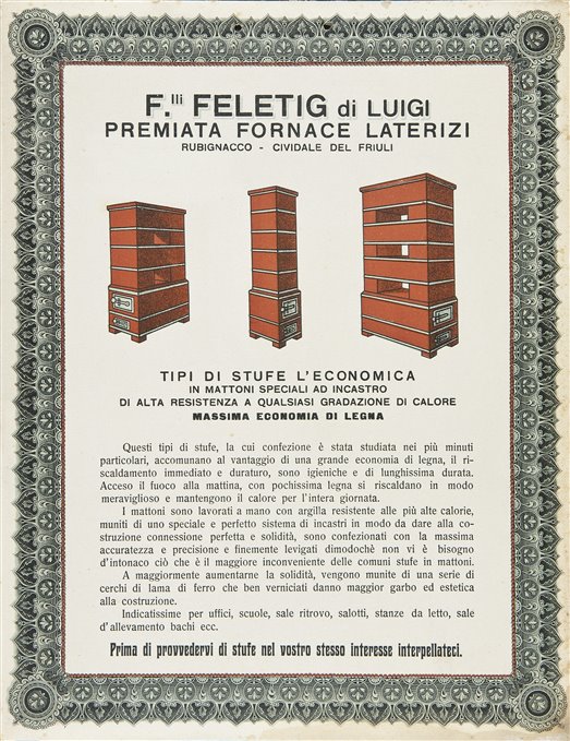 | Note | Campione di cartello pubblicitario realizzato per la ditta F.lli Feletig di Rubignacco, piccola frazione di Cividale del Friuli. L'impostazione del cartello è analoga a quella impiegata per altri affiches che promuovono tali prodotti, una sorta di vetrina dell'esercizio commerciale: raffigurazione di differenti tipologie e modelli del prodotto, denominazione e sede della ditta e testo che descrive qualità e funzionamento dell'utensile. |