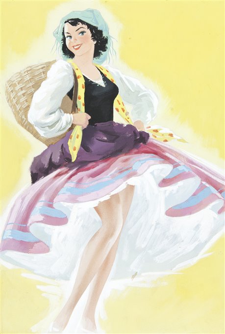 | Note | Bozzetto pubblicitario in cui una giovane fanciulla in abiti tradizionali sembra accennare un passo di danza. La bozza è stata forse realizzata per la promozione di prodotti dell'azienda udinese La Furlana. Fondata nel 1918, la ditta prese il nome da un antico ballo friulano e nel corso del secolo riuscì ad affermarsi a livello nazionale come uno dei maggiori produttori di maglieria intima di qualità. |