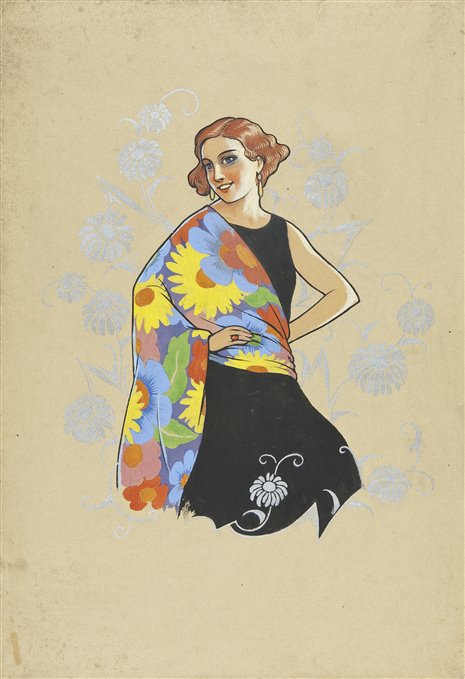 | Note | Bozzetto generico che vede raffigurata una giovane donna che, sopra ad un abito nero, indossa un ampio e sgargiante foulard dal tessuto a fiorami di vari colori che richiamano il fiore bianco ricamato sul vestito. Il bozzetto potrebbe essere progettato per la pubblicità di qualche magazzino, per una sartoria o un negozio di tessuti. Il disegno ricorda gli schizzi fatti dagli stilisti nella crezione di un modello. |