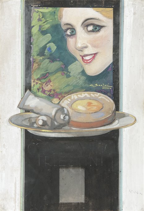 | Note | Bozzetto realizzato da Giovanni Scolari per un calendario promozionale dei Conservifici triestini. In primo piano un piattino su cui sono posati alcuni prodotti di profumeria, in secondo piano il volto sorridente ed "imbellettato" di una giovane donna. Giovanni Scolari, nato a Seniga (Brescia, Italia) il 26 novembre 1882, fu presente nel contributo pubblicitario del 1924 della Verzocchi mattoni refrattari di Milano, che fu opera stranissima, singolare e preziosa (tutto sembrava fuorché un catalogo di mattoni) ed uscì con le cure di Depero e con i contributi, fra xilografie e acquerelli, di Dudovich, Nizzoli, Marius, Cisari. Illustratore di libri per ragazzi e disegnatore pubblicitario, collabora nei primi anni Trenta con “Il cartoccino dei piccoli” di Monza. Collabora più tardi con l'editore Mondadori per le testate a fumetti, e viene coinvolto da Federico Pedrocchi nella realizzazione di una saga come "Saturno contro la Terra", su soggetto di Cesare Zavattini, iniziata nel 1936 per concludersi con un ultimo episodio dopo la guerra. Sulle pagine dei giornali Topolino e Paperino disegna "La galea dalle vele d'argento" (1937), poi "L'aquila fulva" (1938), "Nelle viscere della Terra" (1938), "La nube di gelo" (1940). Per le Edizioni Alpe disegna episodi di "Volpe" per la collana "Le più belle avventure", firmandosi G. Da Brescia. Dopo la guerra disegna "Un uomo contro il mondo" su testi di Mario Gentilini (soggetto ancora di Zavattini). In pubblicità resta notissimo il suo cameriere rosso con vassoio per la Birra Dreher (una copia di questo manifesto è parte del Fondo Chiesa, inv. FC 314). Muore a Milano il 25 marzo 1956. |
