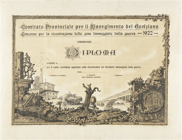| Note | Diploma di Concorso per la ricostruzione delle zone danneggiate dalla guerra indetto dal Comitato Provinciale per il Risorgimento del Goriziano. Gli anni del primo dopoguerra furono un periodo in cui, anziché aprire una nuova era della società italiana, ci si preoccupò di salvare quanto c’era. Avrebbe potuto esserci, in questi anni, una coraggiosa politica economica di rafforzamento capitalistico attraverso le scelte, anche cruente, del confronto internazionale, e si pensò a questo solo con timore; avrebbe potuto esserci, d’altro canto, un assetto cooperativistico e partecipativo sia nell’agricoltura che nell’industria. Tutto questo fu temuto più ancora dell’ipotesi precedente. Si preferì (e fu una scelta propria di una classe politica espressione di una borghesia imprenditorialmente arretrata) la strada del protezionismo doganale da un lato e, dall’altro, quella del diretto sostegno governativo all’industria, rendendola così sempre più dipendente dalle commesse di stato e condizionante tutti i settori dell’economia. Il commercio nel Friuli Venezia Giulia si trovava inevitabilmente in forte calo e così pure la produzione industriale, caratterizzata da alte spese di produzione, da maggiori spese di trasporto, dall’alto costo della forza motrice. La Banca Commerciale Italiana , assieme alla Banca di Sconto del Gruppo Ansaldo, svolse in questa vicenda un ruolo ben preciso. Verso lo stesso sbocco si avviavano le industrie produttrici di energia elettrica della zona (Società Elettrica della Venezia Giulia e Officine Elettriche dell’Isonzo) che vennero assorbite dalla S.A.D.E. non prima che l’Istituto Federale di Credito Per il Risorgimento delle Venezie fosse intervenuto a realizzare la concentrazione di tutte le società esistenti finalizzandole al sostegno dell’apparato industriale regionale. Alle Banche Miste si attribuì il ruolo di accelerare il processo di concentrazione capitalistica. Si finì con il privilegiare il rapporto diretto con alcuni istituti bancari: la annosa e spinosa questione dei danni di guerra da risarcire, per esempio, fu avviata alla liquidazione “con grande vantaggio delle industrie del Goriziano”; lo stato mise a disposizione dell’Istituto
