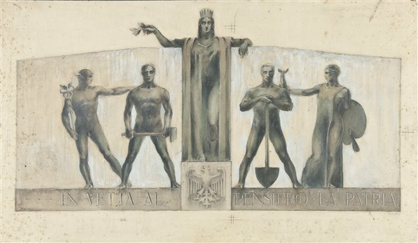 | Note | Realizzato forse per un diploma il bozzetto di autore anonimo “In vetta al pensiero la Patria” prende il titolo dallo slogan che funge da fiero basamento alle figure rappresentate. Al centro, imponente ed innalzata su un podio fregiato da un'aquila - richiamo all'antica romanità cara al regime fascista - la fiera Italia al cui fianco stanno quattro figure, allegorie delle arti e dei mestieri. Il bozzetto aderisce ai principali dettami dell'iconografia mussoliniana in cui la classicità della tradizione e dei valori della romanità divengono emblema della nazione; grande impatto popolare, magniloquenza, celebrazione, propaganda - il tutto rapportato alle nuove direttive razionaliste - vengono utilizzati come efficaci strumenti di comunicazione del regime che vide nel ritorno all'ordine una maniera di formulare uno stile nazionale. Infatti, dopo gli sconvolgimenti sociali dovuti alla guerra, si manifestò la tendenza, in arte, verso un nuovo ordine, che rivalutava il realismo tre-quattrocentesco e quindi la prospettiva, i volumi puri, i valori plastici, aspetti che si leggono anche in questo disegno. |
