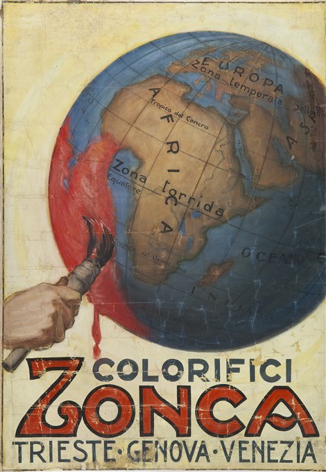 | Note | Bozzetto realizzato per la ditta Zonca. Il disegno intende descrivere attraverso l'mmagine efficace di una mano che, impugnato un pennello, dipinge l'intera superficie del globo terrestre, quanto sia divenuta importante e di prestigio internazionale l'azienda veneziana. A conferma dell'immagine, sottostanti la denominazione dell'industria, le diverse città in cui essa ha sede. La Zonca Industrie Chimiche nasce a Venezia nel 1875 ad opera di Gaudenzio della Zonca come fabbrica produttrice di vernici sottomarine, per poi impiantare una filiale nella città di Trieste, allora porto franco. All'epoca la Zonca era in aperta concorrenza con un'altra industria di vernici e affini, la Gioachino Veneziani s.a. (cartello pubblicitario n. FC052). Nel 1970 avviene la fusione tra queste due aziende, dando vita a Veneziani Zonca Vernici S.p.A. che nel 1975 entrò a far parte di Montedison: il business viene ampliato anche alle vernici che trovano applicazione nel settore edile.