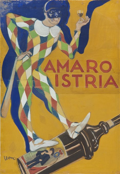 | Note | Bozzetto realizzato per l'amaro Istria, specialità della distilleria liquori della Ditta G.B. Petrali & C di Rovigno. La famiglia Petrali non viene riportata nè dal Benussi nella sua Appendice alla Storia Documentata di Rovigno nè risulta al momento del censimento del '45. Però la sua presenza a Rovigno è testimoniata a fine XIX inizi XX dall'omonima distilleria rovignese di G. B. Petrali & C. come da alcuni manifesti pubblicitari d'epoca e da una grande pubblicità che quasi ricopriva una casa di Rovigno. Un brioso arlecchino, in vacillante equilibrio su una bottiglia di amaro Istria, tiene sul palmo di una mano, con altrettanta precarietà, un bicchierino colmo del gustoso liquore. La posizone inclinata della bottiglia e la sinuosità dell'ombra della maschera conferiscono ritmo e movimento all'immagine. Si notano alcune analogie con il bozzetto di autore anonimo "Pantalone in laguna" (FC 085). Di Leo Leoncini non si conoscono i dati biografici. Pittore attivo a Udine a partire dall'inizio del '900, studia all'Accademia di Venezia. Negli anni '20 ha disegnato due cartelli per manifestazioni avvenute a Udine con connotazioni stilistiche tipiche dell'Art Déco (Città di Udine Tradizionale Stagione Lirica, 1925, ora presso la Collezione Salce, Museo Bailo, Treviso). |