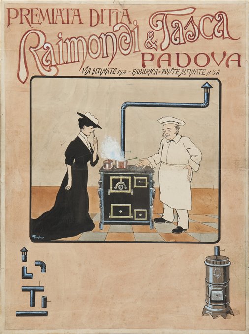 | Note | Bozzetto realizzato per la ditta Raimondi & Tasca di Padova. A differenza di altri bozzetti e affiches pubblicitari di stufe, spargher e affini in cui il campionario dei prodotti è protagonista, concedendo spazio soltanto alla parte di testo - nome della ditta, luoghi delle filiali, descrizione della merce (si veda, a tale proposito, il cartello pubblicitario per la Premiata Fornace Feletig, n. FC104) -, il bozzetto per l'azienda padovana "racconta il prodotto", il suo aspetto e la sua funzionalità, attraverso una scena che vede protagonisti una raffinata ed attenta gentildonna ed un cuoco, un po' intimidito dalla presenza della concentrata dama, intento ad esporle pregi e qualità di un efficiente spargher sul quale stanno cuocendo vaporose e gustose pietanze. |