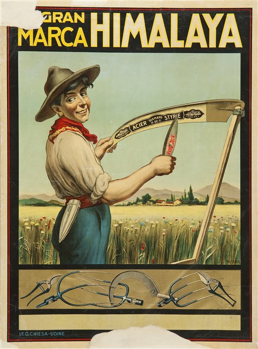 | Note | Il manifesto inquadra in primo piano un giovane uomo in abiti campestri il quale, sguardo verso l'ipotetico compratore, mostra due prodotti "Gran Marca Himalaya" (una falce ed una cote su cui campeggia evidente il marchio di fabbrica); altri attrezzi della stessa marca sono presentati anche in una banda orrizontale nella parte inferiore dell'affiche: un ingenuo espediente per decorare l'immagine e, nel contempo, per promuovere il prodotto. Per quanto riguarda i caratteri tipografici, a campeggiare a grandi dimensioni nella parte superiore del manifesto è il nome del marchio mentre una sorta di slogan si legge, come fosse inciso, sulla lama della grande falce sorretta dal sorridente agricoltore: "Himalaya acier - diamand de - Styrie", slogan mostrato dalla cote tenuta in mano dall'uomo che, per l'occasione, si improvvisa funzionale indicatore. Iconografia simile si trova nel bozzetto n.FC82 realizzato per la promozione di prodotti analoghi, marca Diavolo. |