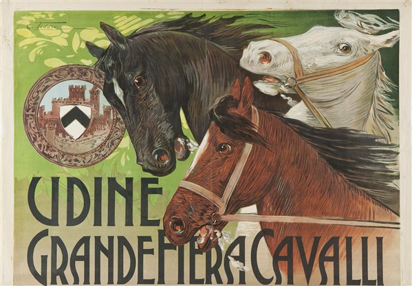 | Note | Parte superiore di manifesto promotore della Grande Fiera di cavalli di Udine, del 1908, realizzata da C. Todaro. Il soggetto dell'affiche, teste di cavalli in corsa - lo si intuisce dalle criniere in movimento - viene spesso utilizzato per manifesti creati per la promozione di manifestazioni ippiche come quelle che avvenivano a Udine tra il XIX e il XX secolo. L'opera datata 1908 recupera, per una fiera di Cavalli in p.zza I maggio, l’icona dell’antico Sigillum Comunis Terre Utinensis risalente al 1385, conservato presso l’Archivio di Stato di Venezia che raffigura il fortilizio medievale. Tre cavalli, un morello, un baio e un grigio appaiono i garanti di premi, degli spettacoli e della grandezza della manifestazione. Il cartello va messo in relazione all’attività promozionale del conte Nicolò Mantica nei confronti delle fiere di cavalli, intese come strumento di promozione e selezione del patrimonio equino della nostra regione. Pur nella sintesi compositiva, la realizzazione evidenzia una buona qualità, opera di C. Todaro per le grafiche Passero, mostra suggestioni dall’arte di Plinio Codognato: i profili delle cavalcature realizzate per la Fiera di Cavalli del 1904 a Verona (a sua volta rielaborazione grafica più sintetica dell’elaborato manifesto per una fiera veronese del 1898) sono riprese specularmente, dall’autore della locandina udinese; identico lo schema compositivo delle teste degli animali, dipinte non già al centro ma sul lato alto del foglio. Lo schema compositivo viene riprodotto quasi integralmente da Todaro nel 1912 (stabilimento Passero, coll. privata), in un avviso del municipio di Udine che regolamenta le fiere in Giardin Grande: un’ampia panoramica delle montagne fa da sfondo al Castello di Udine . Le corse di cavalli costituivano un avvenimento sociale di grande importanza per la città friulana: molti erano infatti gli eventi ippici e, almeno fino alla fine dell’ottocento, si ha notizia certa di corse di cavalli tenute a Udine anche nel mese di aprile, con partenza dall’esterno di porta Aquileia e arrivo in via Mercatovecchio, dov’era collocato il traguardo e dov’erano allestiti i palchi per i giudici di gara e le autorità. Seguitissime
