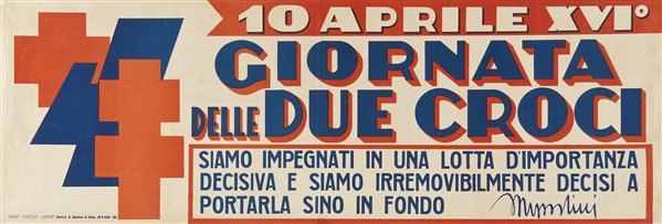| Note | Manifesto realizzato in occasione della Giornata delle Due Croci, celebrata nella città di Udine il 10 aprile del 1938. La grafica del manifesto, essenziale ed incisiva, propone due croci stilizzate - in riferimento al titolo della celebrazione - inframmezzate dal fascio littorio, anch'esso stilizzato. L'affiche riporta inoltre una citazione del duce che si chiude con la riproduzione della firma dello stesso Mussolini. La Giornata delle Due Croci era collegata alla Campagna nazionale antitubercolare e alla distribuzione del francobollo antitubercolare. |