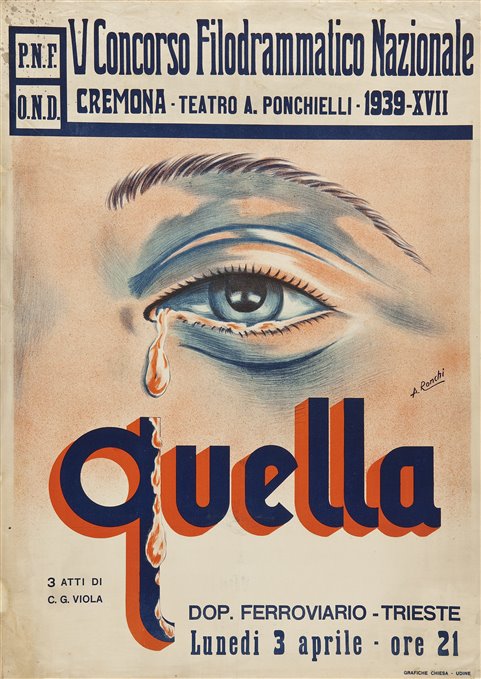 | Note | Manifesto realizzato da Arnaldo Ronchi (1898 - 1985 ) in occasione della un lavoro teatrale che nel 1939 partecipò al Concorso Filodrammatico Nazionale di Cremona e venne poi presentata nella città di Trieste dall'Opera Dopolavoro Ferroviario. Un occhio malinconico dal quale scende una lacrima che va ad infrangersi sulle lettere che compongono il titolo dell'opera rappresenta un efficacie espediente per comunicare, in sintesi, la natura drammatica dell'opera. il melodramma in tre atti, dal titolo "Quella" fu scritta da Cesare Giulio Viola, nato a Taranto il 26 novembre del 1886. Lo scrittore si dedicò prevalentemente al teatro drammatico e compose oltre 30 commedie in 45 anni. Fu infatti uno degli autori più fecondi e applauditi del periodo fra le due guerre. Le sue commedie vennero rappresentate dalle più importanti compagnie teatrali dell'epoca, come la Compagnia Emma Gramatica, Salvini, Pavlova, Ruggeri. Fra le più significative si ricordano: "Il cuore in due" (1926), "Fine del protagonista" (1931) e "Quella" (1933). Il suo nome è legato anche all'attività cinematografica. |