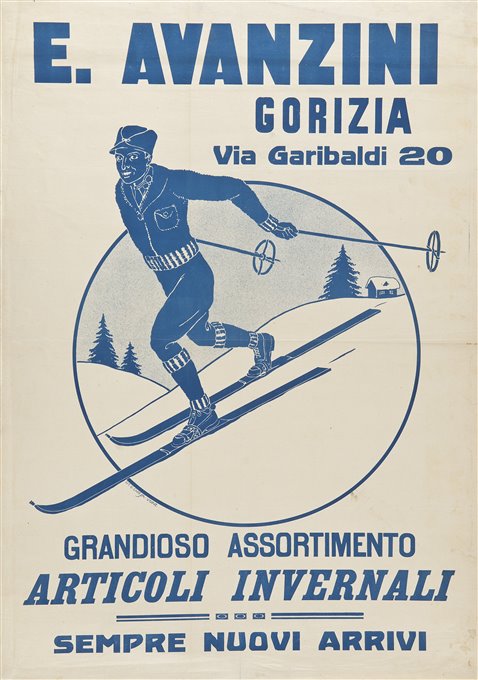 | Note | Manifesto pubblicitario del negozio di abbigliamento sportivo E. Avanzini di Gorizia. L'affiche propone, unicamente ad una clientela elitaria che possa permettersi soggiorni di villeggiatura in esclusive località montane, un “grandioso assortimento di articoli invernali”, promuovendo “sempre nuovi arrivi” e garantendo all’avventore affezionato, a grandi lettere, il venti per cento di sconto sulle proprie merci, “il più bel regalo per le feste pasquali”, come riporta l’inserzione pubblicitaria del negozio goriziano pubblicata più volte nell’ “Eco dell’Isonzo” del marzo 1933. Pertanto se l’obiettivo è quello di pubblicizzare capi d'abbigliamento invernale non c’è soggetto più adatto di uno sciatore che svetta energico tra gelide cime innevate. Il paesaggio montano in cui è immerso l’agile atleta è racchiuso sinteticamente in un cerchio inciso dalle linee diagonali degli sci dello sportivo che travalica i margini dell’immagine, quasi a travolgere l’osservatore. Il dinamismo espresso nel manifesto, benché il soggetto sia più sobrio e lineare, appare analogo a quello concepito da Pietro-Antonio Sencig per l’affiche realizzato in occasione dei Campionati Italiani Seniores di Atletica Leggera, svoltisi a Udine nel luglio 1930 (FC 308 ). Del manifesto stampato per la ditta Avanzini si è conservata anche una prova di stampa (FC 177). |