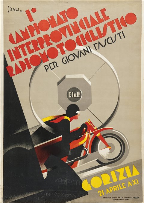 | Note | Manifesto realizzato da Tullio Crali in occasione del Primo Campionato Interprovinciale Radiomotociclistico per giovani fascisti di Gorizia. Protagonista dell'affiche un motociclista con la sua moto rosso fiammante che compare da una scura parete dalle fattezze analoghe a quelle di un fascio littorio. L'uomo sfreccia in salita lasciandosi alle spalle delle scie simili a lamine d'acciaio. Il manifesto avverte la spinta futurista e, in parte, la raccoglie. Ciò è evidente nelle linee antinaturalistiche, sobrie ed essenziali della Art Déco (detta anche ‘stile ‘25’ per l’Esposizione Universale di quel medesimo anno a Parigi dove trionfò). Con l’Art Déco la linea fatta ‘a macchina’, la curva metallica e scultorea, la tridimesionalità cubo-futurista, la luminosità e la cromaticità artificiale, la dinamicità dei grafismi e la strutturazione geometricamente significativa dei campi, danno luogo ad una estetica del manifesto rinnovata, largamente accettabile per il pubblico, nel segno di nuova raffinatezza ed eleganza, nell’immagine, nella moda e nel design. Per ciò che riguarda le tematiche sviluppate, il futurismo aveva coltivato e lanciato nell'immaginario collettivo il mito tutto moderno del movimento e della velocità, e anche da qui, in concomitanza con la meccanizzazione del Paese e con lo sviluppo di industrie quali la Fiat, si diffonde la passione per i mezzi di trasporto della contemporaneità, macchine, aerei e motociclette, queste ultime protagoniste di questo affiche. Tullio Crali (Igalo, 6 dicembre 1910 – Milano, 5 agosto 2000) è stato un pittore italiano. Di famiglia zaratina, nacque in un piccolo paese delle Bocche di Cattaro nell'attuale Montenegro, ove il padre lavorava temporaneamente. Visse a Zara fino al 1922, quando con la famiglia si trasferì a Gorizia. Scoprì il futurismo a quindici anni, mentre era studente all'istituto tecnico della città, e fu influenzato nei suoi primi lavori da Giacomo Balla e Enrico Prampolini. Nel 1928 volò per la prima volta, e l'anno successivo - quello in cui nacque l'aeropittura futurista - si mise in contatto con Filippo Tommaso Marinetti ed entrò ufficialmente nel movimento futurista. Dopo le sue primemostre in Italia, Marinetti lo invitò ad esporre a Parigi, nella prima mostra di aeropittori italiani: era il 1932. Divenne poi amico personale di Marinetti. Dopo la seconda guerra mondiale rimase fedele alla poetica futurista. Dapprima esercitò a Torino, si trasferì poi a Parigi (1950 - 1958, in quegli anni ideò le sassintesi), poi ancora al Cairo (1962 - 1966, insegnò alla scuola d'arte italiana). Dal 1966 fino alla morte visse a Milano. Lì cominciò a raccogliere e catalogare le carte e i documenti che lo riguardavano; nel 1999 ha donato questo suo fondo al MART di Rovereto insieme a 41 opere, cui - nell'anno della morte - faranno seguito altre 48. Tullio Crali, per sua espressa volontà, è sepolto nel cimitero di Macerata dove riposa insieme al figlio Massimo (deceduto il 3 febbraio 2008), città dove risiedono sua moglie Adolfina Savelli e le tre nipoti Marzia, Vibia e Lavinia. |