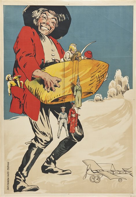 | Note | Manifesto generico che raffigura un sorridente personaggio che sorregge, quasi aggrappandosi ad essa, una cesta colma di giocattoli. Tra i tanti balocchi alcuni burattini che, sospesi ed appesi a lunghi fili, sembrano intenzionati a fuggire dal canestro straripante e, chissà, decollare e volare via a bordo del biplano ai piedi del "burattinaio". Forse il manifesto, dall'insolito soggetto in cui protagonisti sono i colorati giocattoli, era destinato alla pubblicità di qualche prodotto ludico o alla promozione di uno spettacolo teatrale rivolto all'infanzia. |