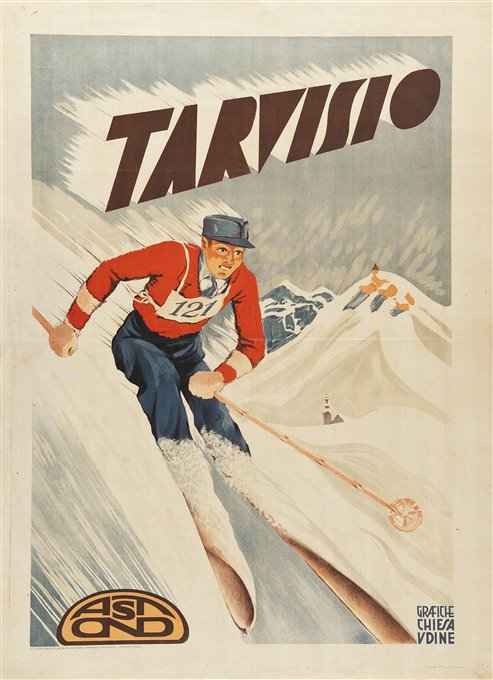 | Note | Bozzetto generico, probabilmente realizzato per la promozione di manifestazioni sportive o località turistiche invernali. Un esemplare analogo appartenente al Fondo Chiesa è il bozzetto di grandi dimensioni n. FC219 creato per l'Adunata Escursionistica Sciatoria delle Tre Venezie e dell'Emilia organizzata dall'OND, Organizzazione Nazionale Dopolavoro, di Tarvisio nel 1932. Il Ventesimo secolo è iniziato da un pezzo, un secolo di straordinario progresso, in campo scientifico e tecnologico prima di tutto, ma anche sotto il profilo economico e politico. La nuova organizzazione della vita urbana allontana l'uomo dalla natura, la macchina sostituisce il cavallo, tuttavia l'uomo tende a ricercare il contatto con l'ambiente naturale. Egli scopre il mare, comincia la conquista della montagna. Il viaggiatore non ricerca solo la natura ma anche lo sforzo fisico, lo sci, il pattinaggio. Questi nuovi comportamenti modificano lo stile di vita e, soprattutto, presuppongongono l'esistenza del tempo libero anche se ancora appannaggio delle persone agiate, "orgogliosa minoranza soddisfatta" che vi si dedica con esuberanza e snobismo. Ed anche lo sport, qualunque esso sia, resta per molto tempo cosa quanto mai elitaria, e a livello popolare è considerato più uno spettacolo che qualcosa da praticare. Soltanto dagli anni Trenta la pratica di un'attività sportiva invernale, le gite e i soggiorni in luoghi di montagna non saranno considerati soltanto un desiderio ispirato allo stile di vita di una ristretta élite alto-borghese ma un'opportunità meno esclusiva. |