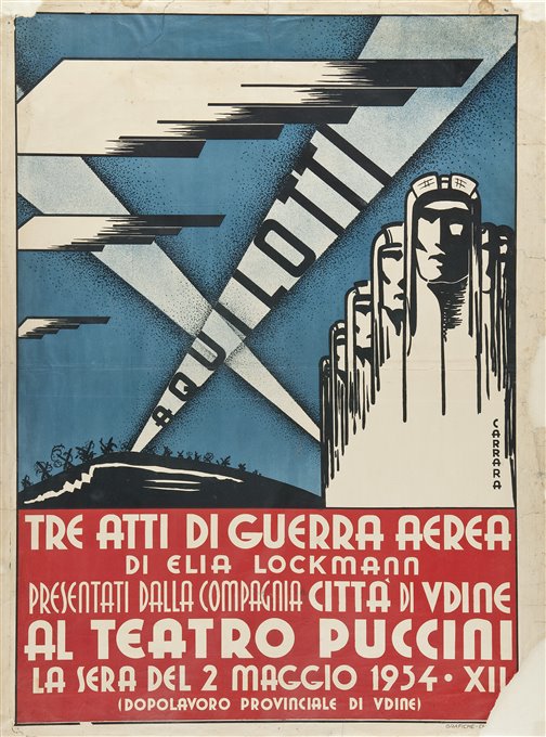| Note | Il manifesto promuove la commedia di Lockmann "Aquilotti : Tre atti di Guerra aerea" presentata dalla compagnia Città di Udine nello storico Teatro Puccini (fu Teatro Sociale) demolito nel 1950. Autore di grande successo popolare, Elia Lockmann (1907-1965) fu attivo negli anni dell'immediato dopoguerra e sino agli anni Sessanta. Gran parte della sua popolarirà è dovuta alla trasmissione, sulle onde della RAI veneta, di una lunghissima serie di suoi atti unici. Due sue commedie, in particolare, furono messe in scena ripetutamente da diverse compagnie teatrali, una delle quali è proprio "Aquilotti : Tre atti di Guerra aerea", pubblicizzata dal Carrara. Il manifesto aderisce a quel tipo di grafica del Ventennio, spesso definita idifferentemente di "Stile fascista" o "futurista", quasi fossero termini intercambiabili e perciò similari. Si tratta invece di un'area composita dove trovano spazio tutta una serie di suggestioni che dimostrano un'attenzione alle più colte correnti europee - il Costruttivismo russo, il razionalismo di De Stjil, il Bauhaus e l'Art Déco - anche se, pur mescolando varie suggestioni, dimostra di avere dei precisi richiami alla poetica futurista, primo tra tutti l'organizzazione compositiva che non procede ortogonalmete bensì per andamenti diagonali, provocando in tale maniera avvincenti ed audaci effetti dinamici. |