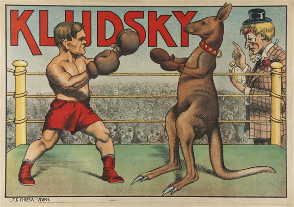 | Note | Il manifesto fa parte di una serie di affiches prodotti dallo Stabilimento Passero-Chiesa per gli spettacoli del gran Circo e Serraglio Fratelli Kludský, narrando però un'inconsueta gag, differente dalle spettacolari immagini di esotiche fiere ed atletici acrobati. Lo scopo non è quindi la suggestione bensì il divertimento suggerito da un simpatico canguro pronto a schernare l'attacco di un concentrato nano - personaggio immancabile in un circo che si rispetti -, il tutto cronometrato da un compito e "serioso" clow, arbitro del match. Il circo, originario della Repubblica Ceca, viene fondato nel 1902 da Antonín Kludský e viene chiuso nel 1934, alla morte dell'ultimo elefante. Kludský, con la sua grande famiglia - ha avuto ben 20 figli - nel corso degli anni alleva e addestra all'incirca 700 animali e fa esibire, davanti ad un pubblico sempre più nutrito ed entusiasta, un numero di esemplari che supera qualsiasi altra compagnia circense fino al primo conflitto mondiale. Sono molti i viaggi in Italia che fece la colorata carovana dei Kludský; se ne ricorda uno che attraversò l'intero Friuli, passando per il Trentino e l'Alto Adige, tra il 1928 ed il 1920, ma si hanno testimonianze di uno spettacolo circense dell'artistica famiglia già nel 1910. Così il Gazzettino Popolare di martedì 8 novembre 1910 nel riferire delle grandiose rappresentazioni del circo Kludský insediatosi a Gorizia, sull’area del vecchio cimitero – suscitando gravi lamentazioni dall’Eco del Litorale - , sul gomito del Corso dove oggi si trova il Parco della Rimembranza: “Duemila circa d’ogni ceto, condizione e nazionalità gremivano l’altro ieri il vasto padiglione del rinomato Circo Serraglio Claudio Kludsky. Se ciò comprova un’altra volta la predilezione del pubblico goriziano per simili spettacoli, al punto da preferirli a quelli teatrali, bisogna però convenire che le rappresentazioni del circo sunnominato sono degne dell’attrattiva da esse esercitate. Bellissimi cavalli ammaestrati, la troupe acrobatica Brunetti, madamigella Orbassani con la sua scimmia ammaestrata, l’elefante gigantesco Baby, il domatore signor Hauer con il magnifico gruppo di leoni e tigri. Vera ammirazione desta il leone cavallerizzo Romulus”.