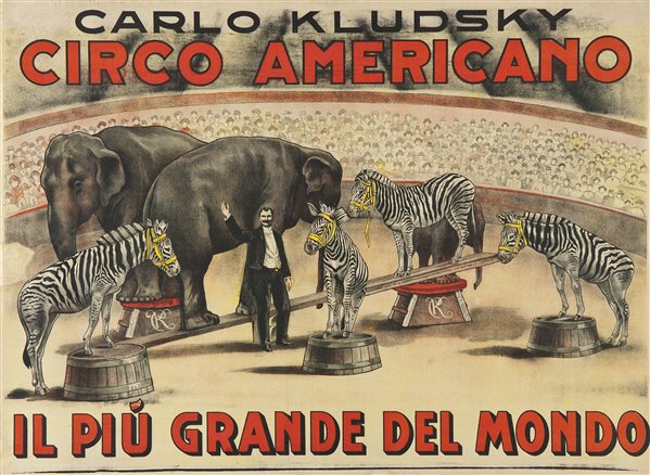 | Note | Il manifesto fa parte di una serie di affiches prodotti dallo Stabilimento Passero-Chiesa per gli spettacoli del gran Circo e Serraglio Fratelli Kludský. Il circo, originario della Repubblica Ceca, viene fondato nel 1902 da Antonín Kludský e viene chiuso nel 1934, alla morte dell'ultimo elefante. Kludský, con la sua grande famiglia - ha avuto ben 20 figli - nel corso degli anni alleva e addestra all'incirca 700 animali e fa esibire, davanti ad un pubblico sempre più nutrito ed entusiasta, un numero di esemplari che supera qualsiasi altra compagnia circense fino al primo conflitto mondiale. Sono molti i viaggi in Italia che fece la colorata carovana dei Kludský; se ne ricorda uno che attraversò l'intero Friuli, passando per il Trentino Alto Adige, tra il 1918 ed il 1920, ma si hanno testimonianze di uno spettacolo circense dell'artistica famiglia già nel 1910. Così il Gazzettino Popolare di martedì 8 novembre 1910 nel riferire delle grandiose rappresentazioni del circo Kludský insediatosi a Gorizia, sull’area del vecchio cimitero – suscitando gravi lamentazioni dall’Eco del Litorale -, sul gomito del Corso dove oggi si trova il Parco della Rimembranza: “Duemila circa d’ogni ceto, condizione e nazionalità gremivano l’altro ieri il vasto padiglione del rinomato Circo Serraglio Claudio Kludsky. Se ciò comprova un’altra volta la predilezione del pubblico goriziano per simili spettacoli, al punto da preferirli a quelli teatrali, bisogna però convenire che le rappresentazioni del circo sunnominato sono degne dell’attrattiva da esse esercitate. Bellissimi cavalli ammaestrati, la troupe acrobatica Brunetti, madamigella Orbassani con la sua scimmia ammaestrata, l’elefante gigantesco Baby, il domatore signor Hauer con il magnifico gruppo di leoni e tigri. Vera ammirazione desta il leone cavallerizzo Romulus”. Con molta probabilità questo manifesto venne realizzato dalla ditta E. Passero, all'epoca già guidata ed amministrata da Giuseppe Chiesa, in occasione dello spettacolo realizzato a Gorizia o, data la natura itinerante di tali manifestazione, nelle limotrofe città di Udine e Trieste. |
