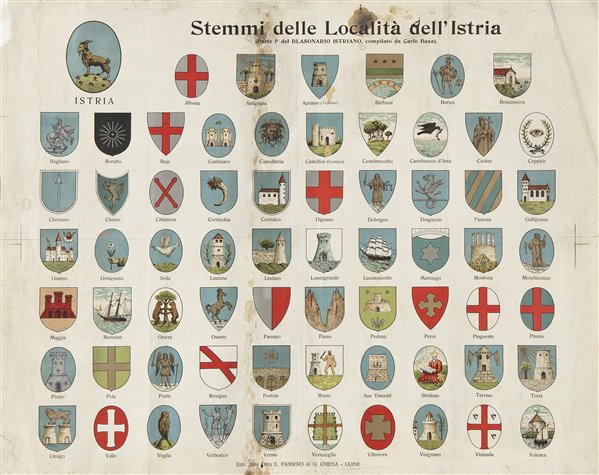 | Note | Il manifesto riproduce il cospicuo cartellone a stampa (60 x 70 cm.) “Edit. dalla ditta E. Passero di G. Chiesa-Udine” del 1920, con 66 stemmi colorati di altrettanti luoghi dell’Istria, con in testa quello della Provincia, ed intitolato “Stemmi delle Località dell’Istria (Parte I del ‘Blasonario Istriano’ compilato da Carlo Baxa)”. Carlo Baxa è nato a Trieste nel 1875, figlio dell’ammiraglio medico dott. Romano Baxa e di Guglielmina contessa de Lombardo; prestò servizio militare come ufficiale degli ussari d’Ungheria; divenne famoso cavallerizzo, presidente di comitati ippici. Si ritirò, quindi, nel paese dei suoi avi, a Lindaro, piccolo borgo del comune di Pisino, dove si occupò con vero entusiasmo della coltivazione delle sue campagne. Patriota, fu uno degli animatori dell’italianità del piranese; nel 1910 fu il segretario della ‘Prima esposizione provinciale dell’Istria’ a Capodistria; nel 1913 ebbe l’incarico di organizzare la sezione italiana dell’Esposizione Adriatica di Vienna. Nei primi decenni del ‘900 attese con lena ad importanti studi araldici sull’Istria; dopo la prima guerra mondiale riprese le sue ricerche ed organizzò l’Esposizione araldica istriana, stendendo successivamente, nel 1920, “una raccolta di oltre 3.000 stemmi istriani (?!)”. Nel 1921-1922 fu segretario della Commissione di Cura di Portorose, mentre dal 1923 al 1943 fu segretario e poi direttore della Commissione di Cura ad Abbazia; dal 1943 al 1947 visse a Trieste, da dove si trasferì, per motivi di salute, a Merano; qui morì nel 1951. Tra le altre cose, pubblicò a Lindaro (!) nel 1910 un libricino dal titolo: “Renzo” - ‘Balletto istriano in due parti (5 quadri)’. Cfr. RADOSSI, “Stemmi di Rovigno”, 196. Di un certo interesse i due lunghi articoli apparsi su "Il Piccolo" di Trieste del 28 febbraio 1920 e 10 dicembre 1932 sull’attività patriottica del ‘capitano di cavalleria’ Carlo Baxa (per suo merito furono spediti ben 32 colombigrammi con informazioni militari ai danni dell’Austria!) e di altri triestini nelle retrovie del Veneto invaso sul finire del I conflitto mondiale. |