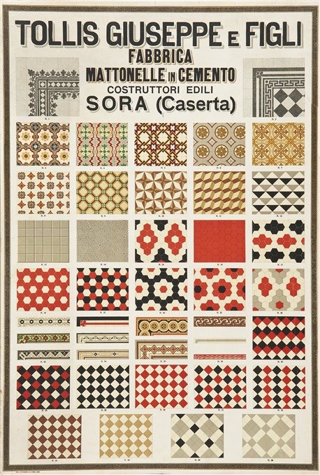 | Note | Il manifesto pubblicitario di piastrelle in cemento della ditta "Tollis Giuseppe e figli" di Sora mostra, com'era in uso all'epoca, un ricco campionario di mattonelle decorate prodotte dall'azienda. Le cosiddette "cementine" in pastina colorata venivano utilizzate spesso in sostituzione dei vecchi pavimenti in argilla pressata che si trovavano nelle case dei centri abitati ed ebbero il massimo impiego tra il 1900 e il 1930, dopodichè sono state rivalutate e proposte come alternativa originale ed elegante ai pavimenti tradizionali. In realtà le cementine o pastine , così come le graniglie o marmette, fanno la loro comparsa già a fine ‘800 con l’avvento della rivoluzione industriale e, di conseguenza, con una maggiore produzione di cemento. Anche questo tipo di pavimento viene inserito nei palazzi dai primi anni del ‘900, anche perché, soprattutto in grandi città come Roma, in seguito a una forte immigrazione da diverse regioni d’Italia, iniziavano ‘fuori porta’ le costruzioni intensive di palazzi di sei, otto piani. Di conseguenza serviva un pavimento che fosse di veloce esecuzione, non come i pavimenti alla veneziana e altrettanto duraturo nel tempo, proponendo sempre un minimo di disegno, decoro e stile. Così , come le graniglie, le cementine sono composte da una base di cemento e sabbia, la loro forma, oltre essere quadrata, come le graniglie, spesso era esagonale. La posa dei pavimenti in cementine veniva effettuata a ‘toppa’ con ‘malta bastarda’(cemento pozzolanico e calce), montate una per una. |