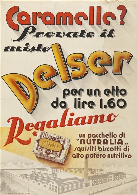 | Note | Manifesto pubblicitario della ditta Delser di Martignacco. La Delser nacque nel 1891 dallo spirito imprenditoriale dell'omonima famiglia di Martignacco e cominciò a produrre biscotti, wafer, caramelle e successivamente biscotti per l'infanzia. Molto famoso e rinomato all'epoca era il "Biscotto Fosforato", che veniva consigliato dai pediatri in quanto digeribile e ricco di sali minerali. Le prime ricette derivarono dalla tradizione conventuale delle monache Canossiane. Inizialmente, e per molti anni, il controllo dei reparti fu affidato alla sapienza e all'autorità delle suore, che con precisione e rigore verificavano l'operato del personale. Nel 1908 nasce il primo stabilimento nel centro del paese di Martignacco, un piccolo borgo 6 km a nord-ovest di Udine. In quegli anni la Delser diventò fornitore della Casa Reale di Savoia e del Papato, e ricevette i Reali in visita per ben due volte presso il proprio stabilimento. Alcuni biscotti, in onore dei loro più nobili consumatori, vennero chiamati con i nomi dei membri della casa Reale: ricordiamo in particolare i due biscotti Margherita ed Elena. La Delser si affermò su tutto il territorio italiano ed estero, partecipò a manifestazioni importanti dove venne riconosciuta per l'elevata qualità dei suoi prodotti. Le numerose richieste dei prodotti Delser e le varie onorificenze ottenute in molteplici Esposizioni, diedero forte impulso all'Azienda che, condotta con tenacia, intelligenza e lungimiranza dei fratelli Delser, cominciò a provvedersi di moderni macchinari ed a produrre una vasta gamma di biscotti con crescente successo in Italia e all'Estero. I biscotti di pasticceria, i wafer ripieni, le caramelle erano confezionati all'epoca in bellissime scatole di latta decorate. Il confezionamento a quei tempi era effettuato del tutto manualmente e solo molti anni dopo è stato soppiantato dalle confezionatrici automatiche. Già dai primi anni di attività, alla Delser la percentuale di donne sul totale dei dipendenti era elevata per quei tempi. Questo ha fatto sì che l'azienda sia stata, oltre che una realtà industriale di riferimento in tutto il Friuli, anche un fattore di emancipazione per la popolazione femminile dei paesi