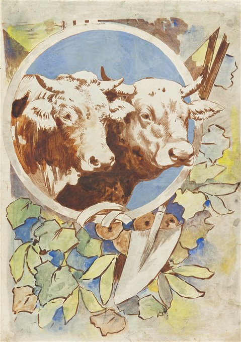 | Note | Bozzetto generico risalente al primo decennio del '900, improntato a un garbato pittoricismo illustrativo aggiornato con un repertorio ornamentale e realizzato con molta probabilità - dal soggetto decorativo composto da due mucche ed una pala avvolta dal fogliame - per la promozione di feste popolari o manifestazioni agricole. Nello spazio privo di disegno e motivi ornamentali andrebbero inserite, in un secondo tempo in caratteri tipografici, le informazioni relative alla manifestazione da promuovere. |