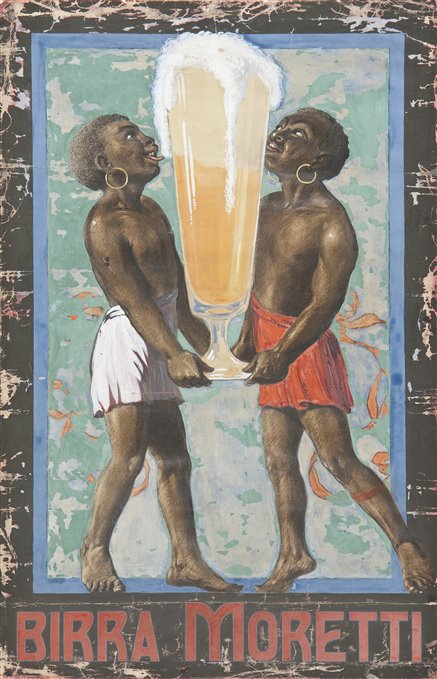 | Note | Dopo la colossale Pinta di birra che dominava il chiosco d’assaggio della Fabbrica Birra Moretti all’Esposizione regionale di Udine del 1903, mentre ancora una volta ritroviamo Giovanni Masutti come autore delle decorazioni murali ricche di ritmi floreali che scandiscono le pareti delle sale della birreria di Viale Venezia, primi e principali protagonisti dell’immagine pubblicitaria della birra, giocando sul nome, sono due veri e propri piccoli “mori” che figurano sui manifesti stampati da Passero Chiesa per la birra Moretti. Protagonista di questa affiche un grande boccale colmo di fresca e schiumosa birra. A sorreggere il bicchiere due esotici moretti che cercano di sorbire ciò che fuoriesce della gustosa bevanda. Il soggetto del manifesto risente della politica di colonialismo, all'epoca attuata dal Regno d'Italia. Personaggi di colore saranno utilizzati dalla Moretti per un'altra nota campagna pubblicitaria dove però l'esotismo di caldi paesi africani verrà sostituito, con ironia e disegno fumettistico, dalle atmosfere del sogno americano rappresentato da due pugili che, invece di boxare, bevono insieme due dissetanti pinte di birra, la Moretti naturalmente. Più di cento anni fa nasceva a Udine, in Friuli, la "Fabbrica di birra e ghiaccio" di Luigi Moretti. Udine era allora una cittadina molto tranquilla, circondata da una cerchia di mura che la comunità locale aveva eretto fino dal 1350. Dentro le vecchie mura, gli udinesi vivevano industriosamente, dediti da generazioni al commercio e all'artigianato. Erano gli anni decisivi per l'unità d'Italia. A quel tempo l'intero Friuli era ancora annesso all'impero Austroungarico, e i moti patriottici erano vivissimi anche in città. Non a caso nel castello che domina Udine era stanziata una guarnigione austriaca, e nella piazza principale erano stati posizionati alcuni cannoni. Fu proprio in questo clima di fermenti - nello stesso anno delle famose battaglie di San Martino e Solferino - che Luigi Moretti, allora trentasettenne, guardando con fermezza e serenità al futuro, decise di costruire la sua fabbrica di birra. Nato da una facoltosa famiglia di mercanti, Luigi Moretti era a quel tempo ben introdotto nel