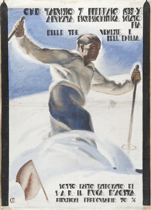| Note | Bozzetto generico di grandi dimensioni creato per l'Adunata Escursionistica Sciatoria delle Tre Venezie e dell'Emilia organizzata dall'OND, Organizzazione Nazionale Dopolavoro, di Tarvisio nel 1932. Un esemplare analogo appartenente al Fondo Chiesa è il bozzetto n. FC015, probabilmente realizzato per la promozione di manifestazioni sportive o località turistiche invernali. Durante il ventennio fascista la pratica dello sport è ritenuta un'attività indispensabile per mantenere una mens sana in corpore sano; predisporre, preparare e conservare energie fisiche e morali necessarie alle esigenze belliche – ideologicamente e nella prassi – era il compito delle scuole e delle organizzazioni sportive del regime. Fiorente si fece infatti l'associazionismo ginnastico che divenne in questo modo un osservatorio privilegiato da cui saggiare gli sforzi compiuti dalla penisola per darsi un’identità di nazione. In realtà lo sport, qualunque esso sia, in Italia resta per molto tempo cosa quanto mai elitaria, e a livello popolare è considerato più uno spettacolo che qualcosa da praticare. Soltanto dagli anni Trenta la pratica di un'attività sportiva invernale, gite e soggiorni in luoghi di montagna non saranno considerati soltanto un desiderio ispirata allo stile di vita di una ristretta élite alto-borghese ma un'opportunità meno esclusiva. |
