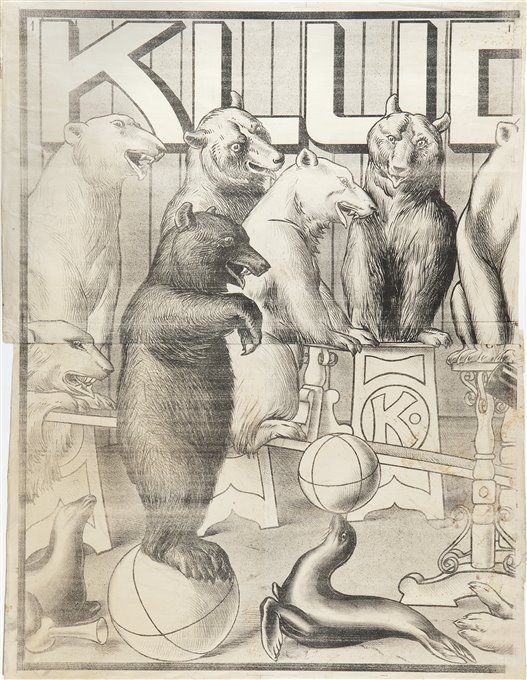 | Note | Il manifesto, non pervenutoci nella sua interezza ma soltanto nella sua parte destra, fa parte di una serie di affiches prodotti dallo Stabilimento Passero-Chiesa per gli spettacoli del gran Circo e Serraglio Fratelli Kludský. Il circo, originario della Repubblica Ceca, viene fondato nel 1902 da Antonín Kludský e viene chiuso nel 1934, alla morte dell'ultimo elefante. Kludský, con la sua grande famiglia - ha avuto ben 20 figli - nel corso degli anni alleva e addestra all'incirca 700 animali e fa esibire, davanti ad un pubblico sempre più nutrito ed entusiasta, un numero di esemplari che supera qualsiasi altra compagnia circense fino al primo conflitto mondiale. Sono molti i viaggi in Italia che fece la colorata carovana dei Kludský; se ne ricorda uno che attraversò l'intero Friuli, passando per il Trentino e l'Alto Adige, tra il 1928 ed il 1920, ma si hanno testimonianze di uno spettacolo circense dell'artistica famiglia già nel 1910. Così il Gazzettino Popolare di martedì 8 novembre 1910 nel riferire delle grandiose rappresentazioni del circo Kludský insediatosi a Gorizia, sull’area del vecchio cimitero – suscitando gravi lamentazioni dall’Eco del Litorale - , sul gomito del Corso dove oggi si trova il Parco della Rimembranza: “Duemila circa d’ogni ceto, condizione e nazionalità gremivano l’altro ieri il vasto padiglione del rinomato Circo Serraglio Claudio Kludsky. Se ciò comprova un’altra volta la predilezione del pubblico goriziano per simili spettacoli, al punto da preferirli a quelli teatrali, bisogna però convenire che le rappresentazioni del circo sunnominato sono degne dell’attrattiva da esse esercitate. Bellissimi cavalli ammaestrati, la troupe acrobatica Brunetti, madamigella Orbassani con la sua scimmia ammaestrata, l’elefante gigantesco Baby, il domatore signor Hauer con il magnifico gruppo di leoni e tigri. Vera ammirazione desta il leone cavallerizzo Romulus”. Con molta probabilità questo affiche, come tutti gli esemplari circensi del Fondo Chiesa realzzati da Pietro Antonio Sencig, è un manifesto generico, ovvero progettato e stampato dallo stabilimento litogafico per il Circo Kludský - che ne ordinava e acquistava numerose copie - senza alcuna indicazione relativa a luoghi