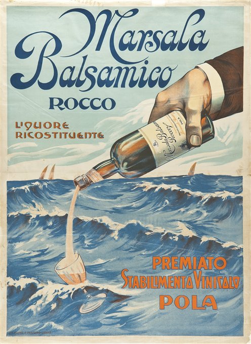 | Note | Manifesto pubblicitario del marsala balsamico Rocco prodotto dal Premiato Stabilimento Vinicolo di Pola, all'epoca sotto il dominio dell'Impero austroungarico che aveva presto compreso l' importanza del porto della città ed aveva iniziato la costruzione intensiva di un grande porto di guerra e del cantiere navale: “Cosciente dell’importanza di questo unico sbocco al mare, lo Stato danubiano iniziò colossali lavori, costruendo una serie di moli, penetranti nello specchio del porto dalla riva, sulla quale contemporaneamente sorgono vasti magazzini: sono gli antichi moli Adamich, Zichy, Rodolfo, Maria Teresa”, scrive Giotto Dainelli nel volume “Fiume e Dalmazia” che l’Utet stampa nel 1925 nella collana dedicata alla Geografia d’Italia. Nell'arco di meno di mezzo secolo Pola, che nella prima metà dell'Ottocento non arrivava a contare 18.000 anime, si trasformò in una città arrivando a più di 41.000 verso la fine del secolo. Il potenziamento del porto ebbe straordinari effetti sulla città croata e tanta importanza la si può cogliere anche nel manifesto del marsala Rocco, manifesto che pubblicizza un vino ma che rende protagonista principale l'immagine del mare. All'orizzonte scivolano sulle acque ondose tre colorate barche a vela, ad indicare quanto la pratica della vela e quella della voga fossero già molto diffuse lungo le coste croate. In primo piano una mano che tiene una bottiglia di marsala e sembra entrare nel manifesto a tema marino per versare il liquore in un calice fluttuante nel mare, quasi come fosse proprio quest'ultimo in attesa di sorbire la gustosa bevanda. A padroneggiare nel manifesto è l'immagine ma nella composizione non manca la scritta: in blu, a ricordare il colore del mare, il nome del prodotto; in rosso, con carattere ben visibile, il nome dello stabilimento oltre alle qualità ricostituenti del prodotto. Il tutto in lingua italiana. Sotto il patronato di Vienna infatti, la lingua ufficiale dei polesi era il tedesco, pero' l' italiano continuava a venir usato e parlato quotidianamente da diversi ceti sociali. Il croato invece venne ben presto estromesso dall' uso. |