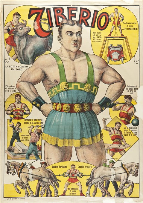 | Note | Il manifesto fa parte di una serie di affiches prodotti dallo Stabilimento Chiesa per spettacoli circensi, forse per il gran Circo e Serraglio Fratelli Kludský, fedele acquirente dell’azienda udinese (il circo, originario della Repubblica Ceca, viene fondato nel 1902 da Antonín Kludský e viene chiuso nel 1934, alla morte dell'ultimo elefante). Il circo era una continua esibizione di cavallerizzi, giocolieri,artisti fantastici e lo spettacolo era diviso in due parti. Nella prima parte gli artisti si esibivano sul filo d' acciaio, facevano giravolte sui cavalli, si presentava l' uomo forzuto che rompeva le catene e, dopo l' intervallo, gli stessi protagonisti diventavano attori. Perché in quel periodo quello che andava di moda era la messinscena di una commedia o di una farsa abbinata allo spettacolo propriamente circense. E così, capitava che l' uomo forzuto diventava il bullo di quartiere e la cavallerizza la donna da conquistare. Giochi di destrezza, virtuosismi canori e scenette alla meno peggio. Con molta probabilità questa affiche, come molti degli esemplari circensi del Fondo Chiesa, verosimilmente realizzato da Pietro Antonio Sencig, è un manifesto generico, ovvero progettato e stampato dallo stabilimento litogafico per i Kludský o per altri spettacoli circensi - all’epoca numerosi e molto in voga - senza alcuna indicazione relativa a luoghi e date dello spettacolo, informazioni che venivano aggiunte in un secondo tempo, da una qualsiasi tipografia, in occasione degli esotici shows. |