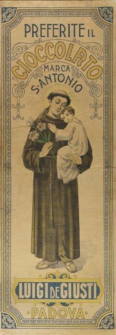 | Note | Manifesto pubblicitario realizzato per il cioccolato marca Sant'Antonio della ditta De Giusti. Protagonista dell'affiche il santo di cui il marchio del prodotto porta il nome. La ditta Luigi De Giusti, fondata nel 1888 a Padova da Luigi De Giusti (Padova 13.06.1867), ha la prima importante sede in via Gazometro e dagli anni '20 del secolo scorso in via Trieste. Nel 1898 viene citata la Società De Giusti in via S. Daniele e in via Turchia, nel 1911 in via Gazometro e poi in via Trieste. Anno 1906: la Ditta De Giusti Luigi vince una medaglia d'argento all'Esposizione Internazionale di Milano. Dal 1 gennaio 1927 la ditta, fabbrica e commercio all'ingrosso e al minuto di caramelle, confetture, cioccolato e affini, cessa l'attività e viene sostituita dalla "Società Anonima Luigi De Giusti". Dal 6 febbraio '28 la Società è messa in liquidazione e cessa la produzione nel '30. Ad oggi sono ricercatissime dagli appassionati le scatole in latta a cilindro o a bauletto della De Giusti. |