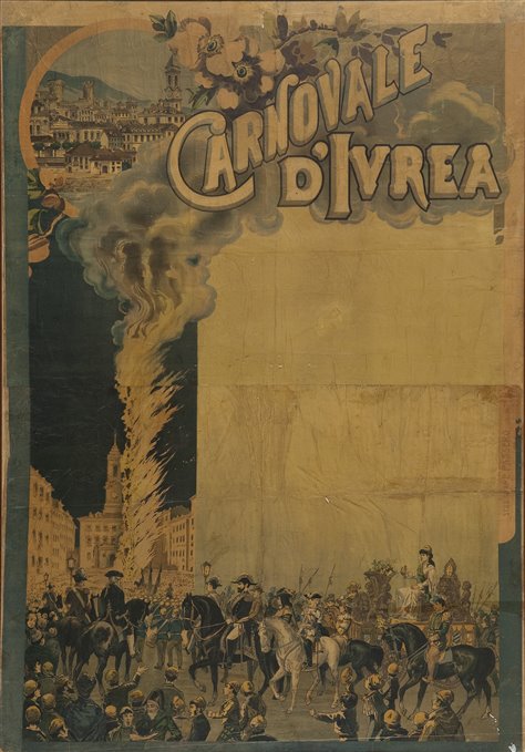 | Note | Manifesto di promozione del Carnevale d'Ivrea. Da documenti e affiches della stessa tipologia si desume che lo spazio del manifesto privo di decori e illustrazioni era riservato al testo della Canzone del Carnevale, tradizionalmente intonata nel corso dei goliardici festeggiamenti. Il leggendario Carnevale di Ivrea è un evento unico, riconosciuto come manifestazione italiana di rilevanza internazionale, un “sogno” che si manifesta ogni anno portando nelle vie e nelle piazze della città di Ivrea storia, tradizione, spettacolo, emozioni e grandi ideali. In questo evento storia e leggenda si intrecciano per dar vita ad una sequenza spettacolare che travalica e fonde i secoli. Lo spirito dello Storico Carnevale vive nella rievocazione di un episodio di affrancamento dalla tirannide, che si fa risalire al medioevo: un barone che affamava la Città venne scacciato grazie alla ribellione della figlia di un mugnaio che non volle sottostare allo jus primae noctis e che accese la rivolta popolare. In questa rievocazione il Carnevale si rinnova ogni anno come grande Festa Civica durante la quale la comunità di Ivrea celebra la propria capacità di autodeterminazione. L’eroina della festa è la Mugnaia, al suo fianco il Generale, che fin dai primi anni dell’800 ha il compito di garantire un corretto svolgimento della manifestazione, insieme al suo Stato Maggiore Napoleonico, composto da valenti Ufficiali a cavallo e graziose vivandiere. Completano la galleria dei personaggi storici il Sostituto Gran Cancelliere, il Magnifico Podestà garante della libertà cittadina, il Corteo con le Bandiere dei Rioni rappresentati dagli Abbà ed i Pifferi e Tamburi. A riempire di colori e profumi la città, vi è poi la famosa e spettacolare Battaglia delle Arance, momento di grande coinvolgimento e forte emozione, rievocazione della ribellione popolare alla tirannia. Nella battaglia il popolo, rappresentato dagli aranceri a piedi sprovvisti di qualsiasi protezione, combatte a colpi di arance contro le armate del Feudatario, rappresentate da tiratori su carri trainati da cavalli, che indossano protezioni e maschere che ricordano le antiche armature. In segno di partecipazione alla festa tutti i