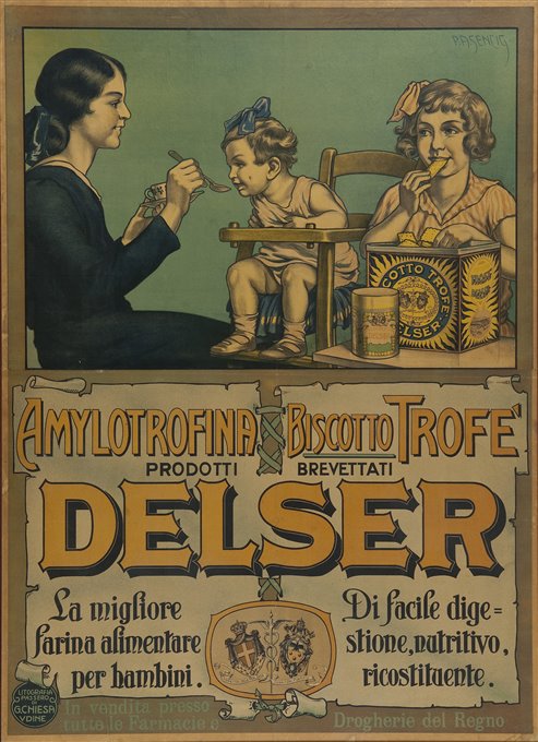 | Note | La pubblicità che sempre più spesso si rivolge alle donne e le rende protagoniste non soltanto della scelta ma anche dell’offerta del prodotto ricorre nel ventennio fascista a liete scene di intimità familiare che esse ben conoscono vivendole quotidianamente. Ed ecco quindi il Biscottificio Delser di Martignacco – affezionato cliente di Enrico Passero prima e di Giuseppe Chiesa poi - che negli anni Venti, per mano di Pietro-Antonio Sencig, propone a grandi e piccini l’amylotrofina, “la migliore farina alimentare per bambini”, e il biscotto Trofè “di facile digestione, nutritivo e ricostituente” preparato secondo una ricetta derivata dalla tradizione conventuale delle monache Canossiane. Scrive il “girovago”, alias Chino Ermacora su "La Panarie" (Il girovago, Industrie friulane, Il Biscottificio Delser, in “La Panarie”, I, n. 2, marzo aprile 1924, p.64): "Una fuga di bimbi con le mani protese verso un biscotto enorme, mi richiama alla mente--certi piccoli che, smesso il biberon, addentano con le gengive il friabile dolce e sorridono beati sminuzzandolo fino a restarne con poche briciole tra le dita. E poi le immagini si alternano: un capezzale su cui un infermo attende la lenta guarigione, ed in disparte il dolce generoso che ristora il suo stomaco sfibrato dal male. E poi ancora, fra nimbi di fiori, vassoi colmi di fragranti biscotti, e candor di tovaglie ed iridi di cristallo: nozze d’amore nella giovinezza. E poi una tazza fumante nell’inverno che viene, entro la quale si rammollisce il dolce squisito che della bionda spiga conserva il colore, che del sole di giugno trattiene i biondi riflessi..”. L’affiche si avvale di un linguaggio domestico e rassicurante che sembra suggerire alle donne di ogni età quale sia la loro autentica, innata aspirazione. Ad accreditare i prodotti e il simpatico siparietto che li accompagna spiccano, alla base del manifesto, gli stemmi della Casa Reale di Savoia e di Papa Pio XI, fedeli fruitori dell’azienda friulana. La Delser nacque nel 1891 dallo spirito imprenditoriale dell'omonima famiglia di Martignacco e cominciò a produrre biscotti, wafer, caramelle e successivamente biscotti per l'infanzia. Molto famoso e rinomato