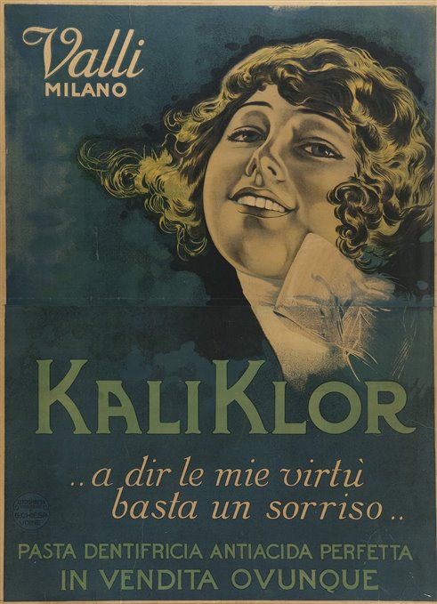 | Note | Talvolta la scrittura in versi può divenire fonte di guadagno, anche in misura consistente. Uno dei campi di azione più remunerativo per versificatori muniti di abilità tecnica e fantasia è quello della pubblicità, in cui, dai primi del Novecento, hanno gran fortuna messaggi promozionali basati su rime baciate, assonanze e consonanze varie od altri ingegnosi effetti poetici. Una vicenda storica che merita di essere qui rievocata è quella del dentifricio Kaliklor. Nel 1919 la ditta Vermondo Valli di Milano, proprietaria della Profumeria Inglese Rimmel, bandì un concorso per una frase adatta a reclamizzare il suo dentifricio. La giuria, composta da Maria Melato, Marco Praga, Dario Niccodemi, Giuseppe Adami ed altre celebrità del teatro di allora, non ebbe dubbi, la frase da premiare con le 5.000 lire messe in palio dalla ditta Valli era un delizioso endecasillabo: A dir le mie virtù basta un sorriso. Nel corso degli anni il nome del dentifricio scomparve del tutto; ma il verso, stupefacente per la sua appropriatezza e poeticità, è tuttora vivo nel nostro linguaggio. Un verso talmente bello che, col passare del tempo, essendo caduto nell’oblio il nome del suo autore (tale Adriano Mirandoli di Roma), venne immeritatamente attribuito a D’Annunzio (è peraltro da notare che non a caso il nome di D’Annunzio fu ipotizzato a proposito di quell’eccezionale verso. Il Nostro, infatti, oltre ad essere l’Immaginifico Vate di cui tutti sappiamo, era anche un pubblicitario non meno immaginifico). Il manifesto è parte di quel genere di cartelloni pubblicitari in cui sono raffigurati personaggi e ambienti tipici della società borghese dell’epoca, a cui la pubblicità si rivolgeva. In questo genere di pubblicità, detta anche "pubblicità di artista", si nota solitemente l’assenza di tecniche comunicative, mancano veri e propri slogan e mancano veri e propri personaggi. Ci si affida principalmente al visual (l'elemento visivo), mentre pochi sono gli slogan; fanno eccezione alcuni rari casi, uno dei quali è proprio quello della pubblicità del dentifricio "Kaliklor", per il quale fu coniato lo slogan "… a dir le mie virtù basta un sorriso…", |