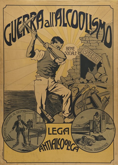 | Note | Ai primi del 1900 si assiste alla crociata contro l’alcolismo in tutta Europa, i decessi per cirrosi superano di gran lunga la soglia di guardia e lo stato sociale viene messo in pericolo. Aumentano i delitti di sangue e i reati dovuti all’assunzione di alcol, pertanto per calmierare la situazione si procede alla privatizzazione delle aziende di distillati in alcune nazioni e alla messa al bando dell’assenzio che scompare da tutti i ricettari. Per quanto concerne la situazione in Italia significative le parole di Antonio Giolitti pronunciate nel corso di una discussione sul bilancio nel giugno 1909: "Quanto al consumo del vino siamo tra due correnti: l’una dei sanitari che affermano che il vino fa male e l’altra degli economisti che raccomandano di bere molto di più, per evitare la crisi vinicola". Questa è in definita un ottima sintesi del dibattito ricorrente sul vino e sugli effetti sociali e politici dell’uso smodato dello stesso e degli alcolici in generale Una statistica del 1884 informa che il consumo medio annuo di vino per abitante in Italia è di litri 68,4. Nell’ultimo decennio del secolo, questa media nazionale sale a 91 litri. La tendenza alla repressione dei comportamenti socialmente devianti originati dall’abuso di alcool ed alle malattie fisiche e psichiche da essi derivanti vengono spesso associati ad una lettura socio-antropologica di stampo positivistico-lombrosiano applicato alle classi subalterne. Mentre l’Enciclopedia Medica Italiana afferma, nel 1868, che il vino «favorisce la digestione, l’introduzione e quindi l’assorbimento di altro materiale alimentare e fisiologico e (…) l’alcol rende possibile che l’uomo lavori con maggiore attività e che spieghi maggior forza e per più lungo tempo», altri medici post-unitari pongono negli stessi anni questioni somatiche, legate ai danni al corpo e ai disturbi mentali legati all’abuso di alcol. La nuova entità nosologica legata all’alcolismo come malattia e non più soltanto come vizio prende piede, basti pensare ad un opuscolo propagandistico uscito nel 1904 in cui si sosteneva che "il vizio del bere è prima di tutto fonte di miseria e la miseria è per se stessa tra le cause prime del dissolvimento della