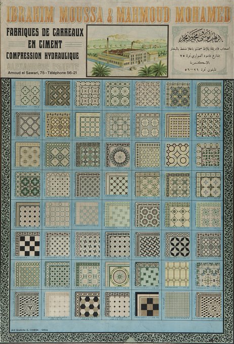 | Note | Il manifesto pubblicitario di piastrelle in cemento della ditta "I. Moussa & M. Mohamed" ad Alessandria d'Egitto mostra, com'era in uso all'epoca, un ricco campionario di mattonelle decorate prodotte dall'azienda. Le cosiddette "cementine" in pastina colorata venivano utilizzate spesso in sostituzione dei vecchi pavimenti in argilla pressata che si trovavano nelle case dei centri abitati ed ebbero il massimo impiego tra il 1900 e il 1930, dopodichè sono state rivalutate e proposte come alternativa originale ed elegante ai pavimenti tradizionali. In realtà le cementine o pastine , così come le graniglie o marmette, fanno la loro comparsa già a fine ‘800 con l’avvento della rivoluzione industriale e, di conseguenza, con una maggiore produzione di cemento. Anche questo tipo di pavimento viene inserito nei palazzi dai primi anni del ‘900, anche perché, soprattutto in grandi città come Roma, in seguito a una forte immigrazione da diverse regioni d’Italia, iniziavano ‘fuori porta’ le costruzioni intensive di palazzi di sei, otto piani. Di conseguenza serviva un pavimento che fosse di veloce esecuzione, non come i pavimenti alla veneziana e altrettanto duraturo nel tempo, proponendo sempre un minimo di disegno, decoro e stile. Così , come le graniglie, le cementine sono composte da una base di cemento e sabbia, la loro forma, oltre essere quadrata, come le graniglie, spesso era esagonale. La posa dei pavimenti in cementine veniva effettuata a ‘toppa’ con ‘malta bastarda’(cemento pozzolanico e calce), montate una per una. |