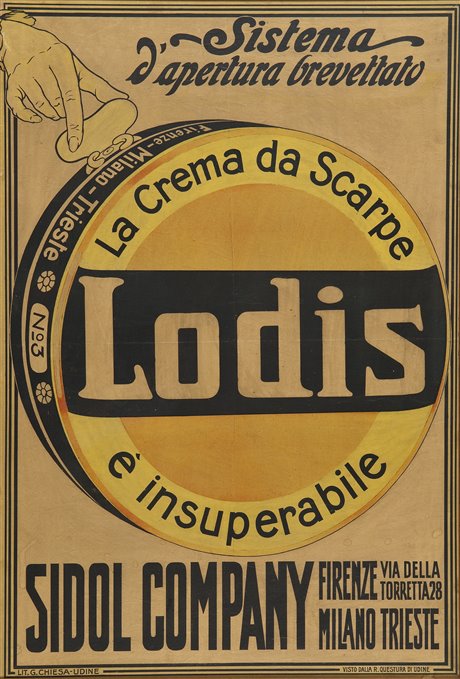 | Note | La pubblicità dei prodotti Sidol è presente nel Fondo Chiesa con numerosi esemplari, tra manifesti, bozzetti e locandine. Sidol Company Limited (Sidol a.g.l.) è stata una fabbrica italiana, con sede a Trieste, a Firenze e a Milano, di lucidi per metalli ed affini oltre che di prodotti per calzature. In questo manifesto la merce reclamizzata è "un'insuperabile" crema da scarpe dal nome - Lodis - che, se letto da destra verso sinistra, con una lettura speculare, non è altro che la denominazione dell'articolo ed altresì, il marchio di fabbrica. In primo piano l'immagine della scatola, all'epoca fatta di latta, contenente il prodotto. A caratteri monumentali, i nomi dell'azienda e dell'ineguagliabile lucidante; con lettering differente l'indicazione sul sistema di apertura, "brevettato", a suggerire la semplicità del meccanismo che va a conferire ulteriore affidabilità e qualità al prodotto. Qualità sempre ribadita nei vari progetti pubblicitari della ditta Sidol. Non a caso, in altri modelli di scatole di crema da scarpe Lodis-Sidol, oltre ai nomi di merce e azienda, veniva anche impresso sul coperchio - poi riprodotto su manifesto o locandina - lo slogan: “Colore extra rende le calzature come nuove ravvivandone il colore” |