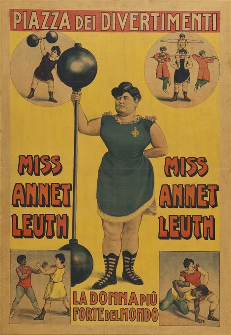 | Note | Il manifesto fa parte di una serie di affiches prodotti dallo Stabilimento Passero di G. Chiesa per spettacoli circensi. Il circo era una continua esibizione di cavallerizzi, giocolieri, artisti fantastici e lo spettacolo era diviso in due parti. Nella prima parte gli artisti si esibivano sul filo d' acciaio, facevano giravolte sui cavalli, si presentava l' uomo forzuto - o la donna più forte del mondo - che rompeva le catene e, dopo l' intervallo, gli stessi protagonisti diventavano attori. Perché in quel periodo quello che andava di moda era la messinscena di una commedia o di una farsa abbinata allo spettacolo propriamente circense. E così, capitava che l' uomo forzuto diventava il bullo di quartiere e la cavallerizza la donna da conquistare. Giochi di destrezza, virtuosismi canori e scenette alla meno peggio. Con molta probabilità questo affiche, come molti degli esemplari circensi del Fondo Chiesa, forse realizzato come molti dei manifesti circensi del Fondo Chiesa da Pietro Antonio Senci, è un manifesto generico, ovvero progettato e stampato dallo stabilimento litogafico per qualche spettacolo circense - all’epoca numerosi e molto in voga - senza alcuna indicazione relativa a luoghi e date dello spettacolo, informazioni che venivano aggiunte in un secondo tempo, da una qualsiasi tipografia, in occasione degli esotici show. L'immagine della donna, Annet Leuth, è tratta da una nota fotografia dei primi del '900 che divenne poi soggetto di molti cartelloni e manifesti circensi. |