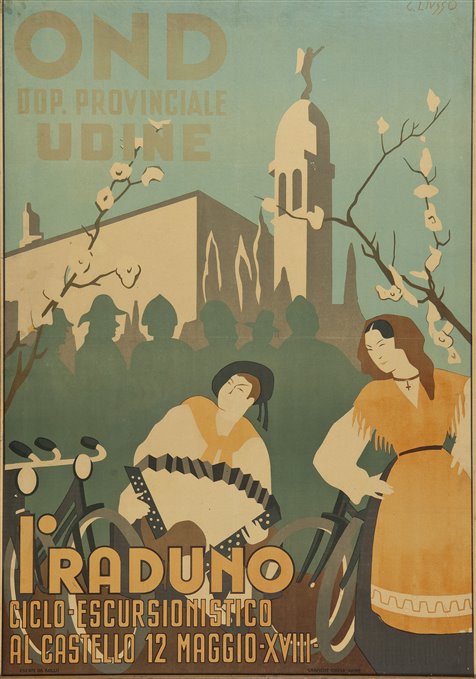 | Note | Manifesto realizzato in occasione del Primo Raduno Ciclo-Escursionistico organizzato dall'O.N.D. di Udine. Una coppia in abiti tradizionali friulani accanto ad una fila di biciclette raccontano in immagini le principali attrattive del Raduno; fa loro da suggestivo sfondo il Castello di Udine, icona della città. Nel manifesto l'anima rurale riconquista lo spazio cittadino e il contadino con fazzoletto al collo allieta e accompagna con la musica di una fisarmonica un'energica fanciulla. Autore dell'affiche Giuseppe Liusso. Liusso (Camino al Tagliamento, 1911 – Udine, 1993), più noto come Bepi, fu artista autodidatta esponente di una “pittura coerente, e gradevole, e valida: che tocca vette di alta poesia nelle visioni ampie ed incantate di paesaggi e di città del mondo” (Bergamini 1991). La sua pittura mutò nel tempo: dai volumi ben definiti, dalla stesura pittorica a piccoli tocchi di colore degli anni Trenta al ductus, svirgolato e sintetico, del secondo dopoguerra. Fu ben inserito nel clima artistico udinese essendo il referente del “Sindacato degli artisti” e fece parte di una generazione di artisti, nati nei primi decenni del ‘900 (come Ernesto Mitri, Giovanni Pellis, Antonio Coceani, Giovanni Moro) fuori delle correnti di moda e attenti piuttosto a registrare le impressioni della natura. Tanto è vero che Liusso mai abdicò al filone figurativo, tradizionale in Friuli. Non fu però provinciale: se il Friuli, colto nei suoi angoli più nascosti, fu al centro del suo interesse, amò viaggiare e conoscere paesi lontani, che divennero soggetto dei suoi dipinti. Centinaia di album e bozzetti, raccolti con amore da Elisabetta Canciani e mai esaminati finora, hanno permesso di ricostruire i suoi viaggi seguendo le annotazioni che puntigliosamente apponeva sotto gli schizzi. Visitò le più rinomate località di tutta Italia, dell’Europa rimangono gli appunti di viaggio a Losanna, Digione e Parigi (1954), Francia, Svizzera e Spagna (1980). Si recò in paesi lontani ed esotici come Perù e Messico (1969), Canada, Malesia, Singapore e Bali (1972), Hong Kong e Bangkok (1975), Cina facendo disegni ripresi in numerosi dipinti. Centinaia di quadri furono preparati, dunque, da migliaia di disegni, fissati in piccoli album da disegno a carta ruvida, su cui registrava le prime impressioni. |